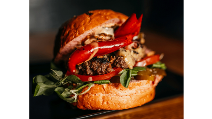 mięso wołowe, sos własny i czosnkowy, cheddar, bekon, cebula czerwona w konfiturze, jalapeno, chilli grillowane, pomidor, roszponka, prażona cebulka