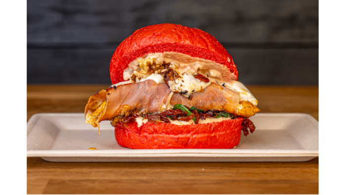 Bułka, filet z kurczaka grillowany, szynka parmeńska, mozzarella, suszone pomidory, cebula czerwona, szpinak, orzechy włoskie, sos własny