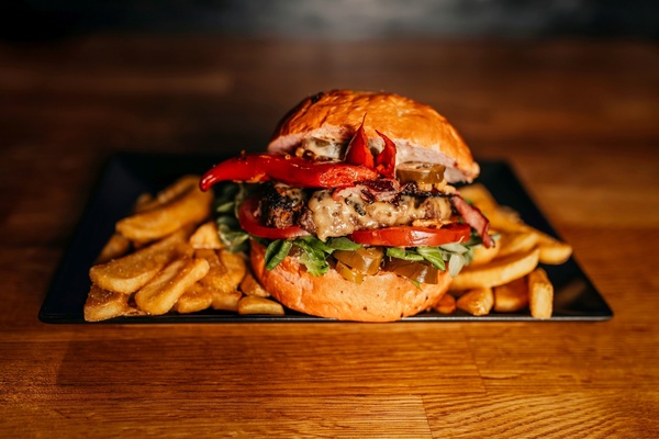 Burger Devil Dragon (Bułka kolorowa, mięso wołowe 150g, sos własny i czosnkowy, cheddar, bekon, cebula czerwona w konfiturze, jalapeno, chilli grillowane, pomidor, roszponka, prażona cebulka) frytki do wyboru