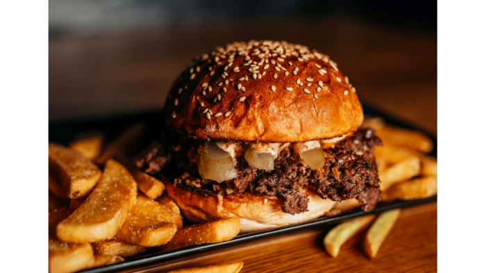 Burger Crushed Dragon (Bułka, mięso wołowe smash 2x100g, cebula czerwona, ogórek kiszony, ser cheddar i mimolette) frytki do wyboru