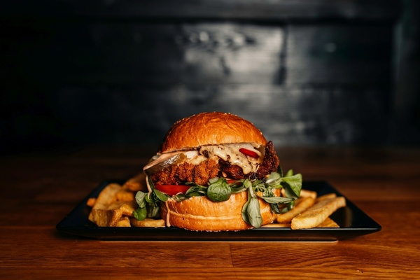 Burger Amaru (Bułka kolorowa, kurczak panierowany , ser cheddar, ogórki kanapkowe, rukola, cebula, pomidor, sos własny, sos czosnkowy) frytki do wyboru