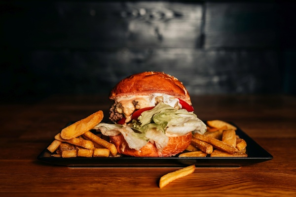 Burger Griffin (Bułka kolorowa, mięso wołowe 150g, ser cheddar, sosy własne, pomidor, cebula czerwona, ogórek, sałata), frytki do wyboru